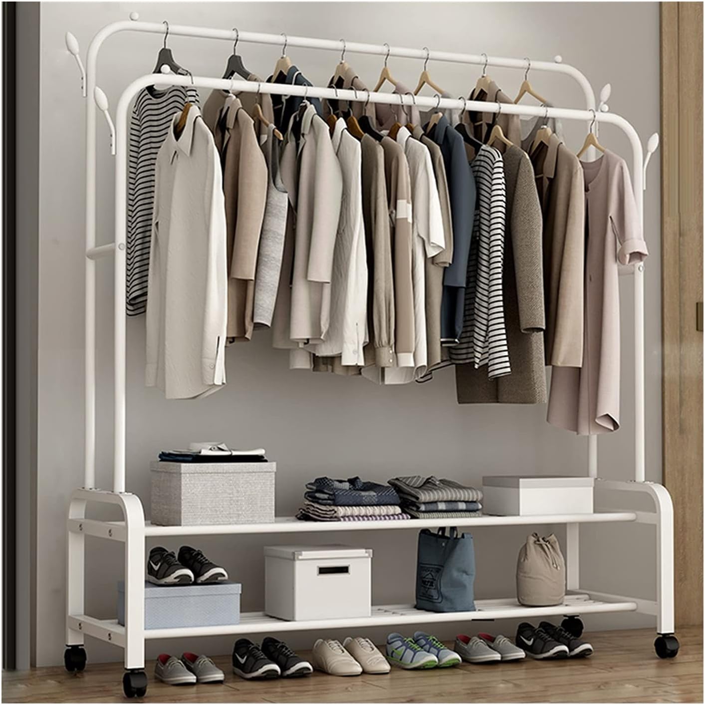 علاقة معاطف، علاقة ملابس مستقلة بعجلات | قضبان معدنية مزدوجة متعددة الوظائف