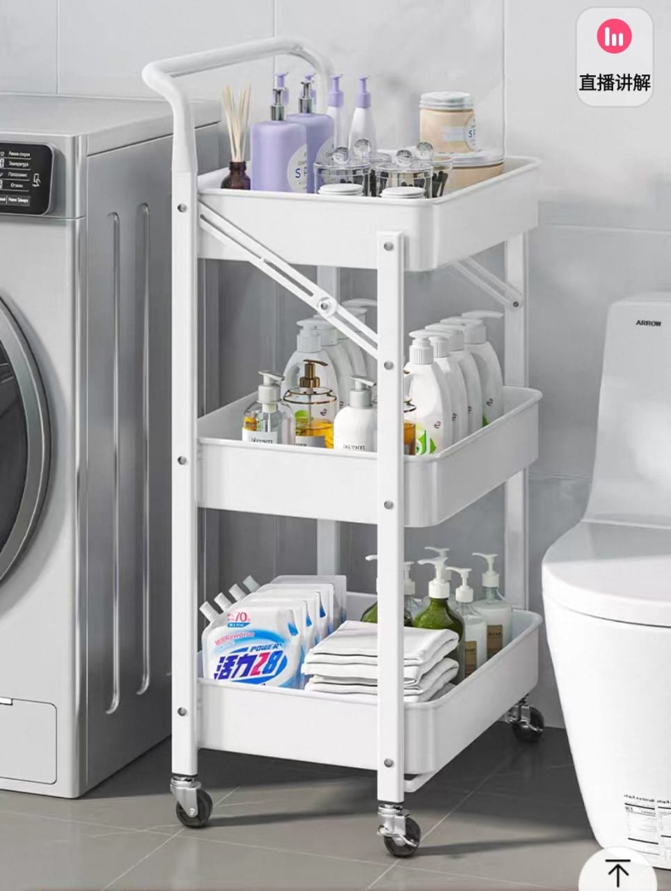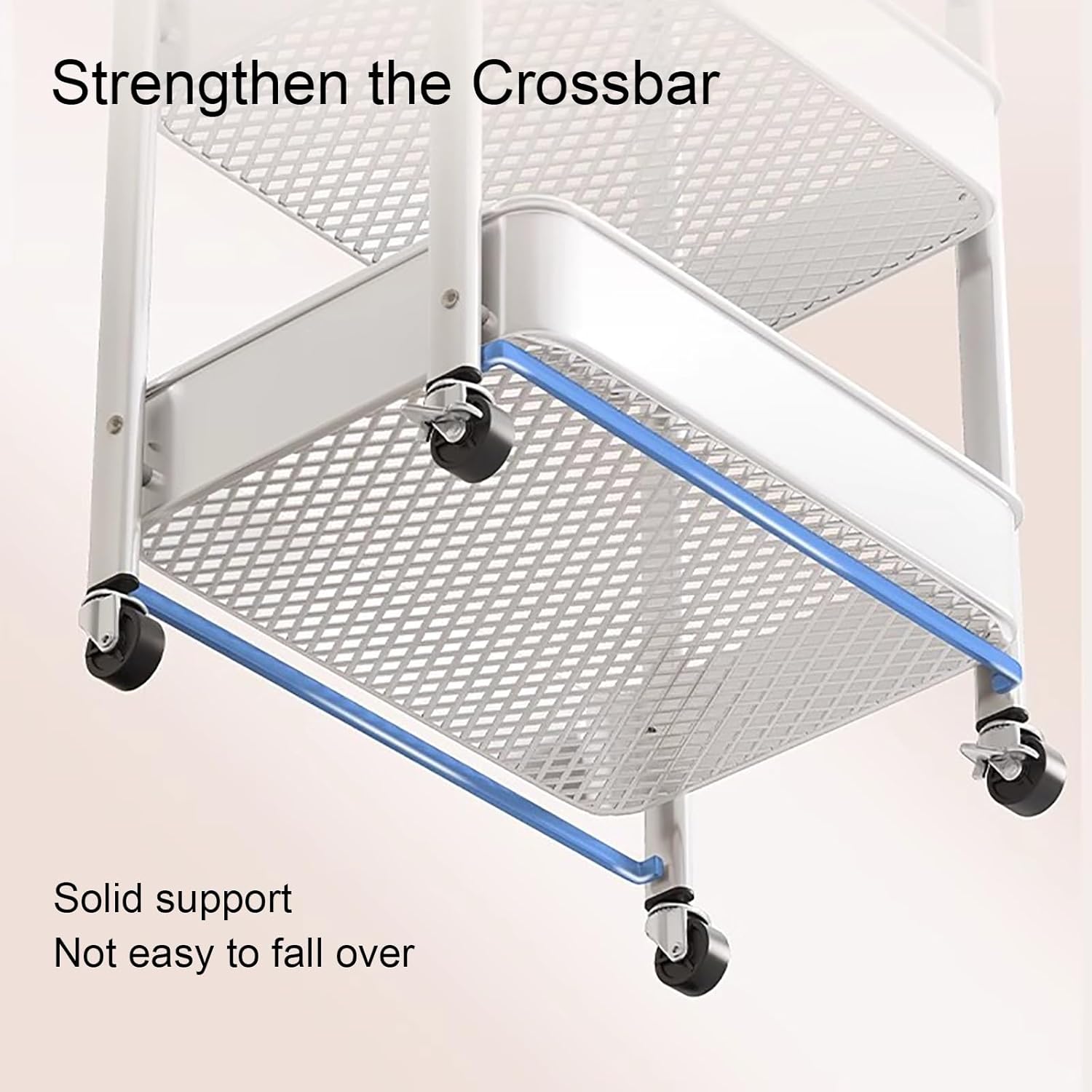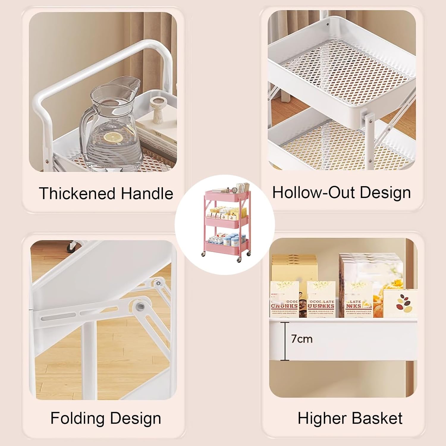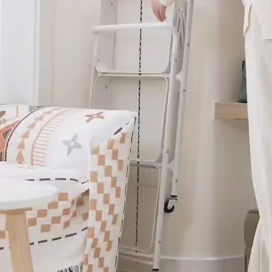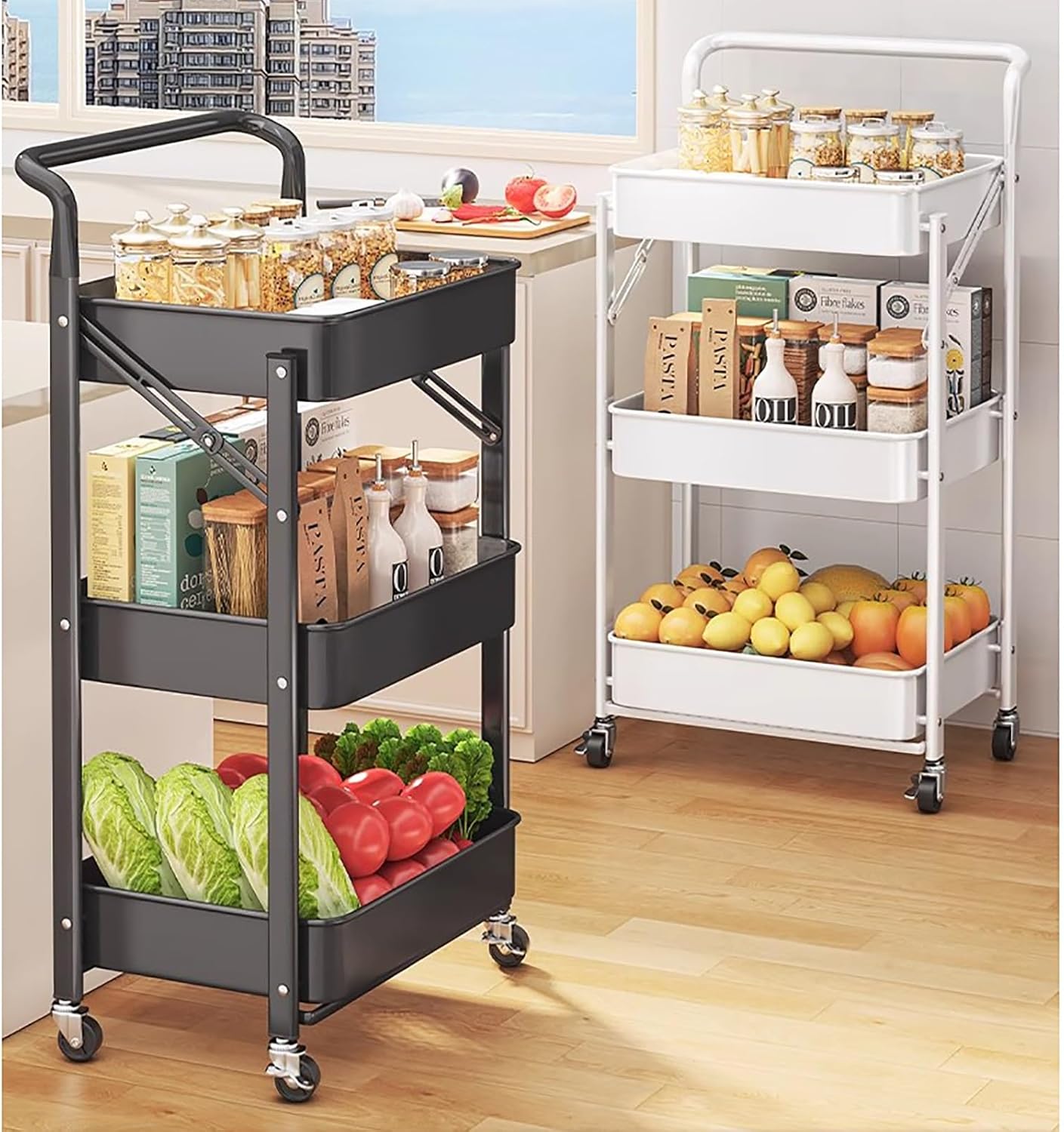 - عربة تخزين متعددة الاستخدامات وقابلة للطي: هذه العربة المصنوعة من الفولاذ الكربوني تُعد تخزينًا متعدد الاستخدامات لمختلف المساحات. فهي مناسبة للمطبخ لتنظيم الفواكه والخضراوات، وفي غرفة النوم للكتب، وفي الحمام لمستلزمات النظافة.