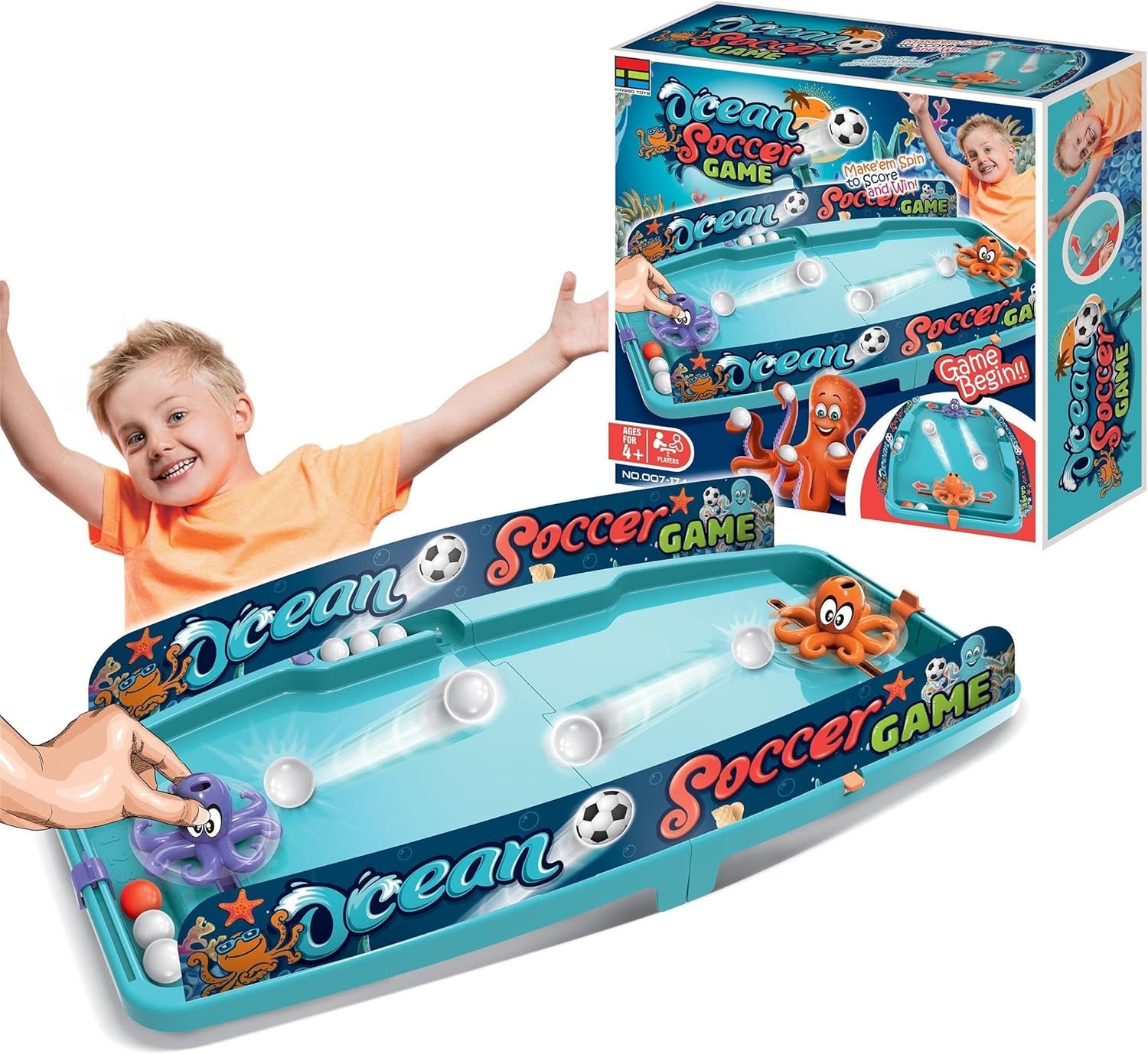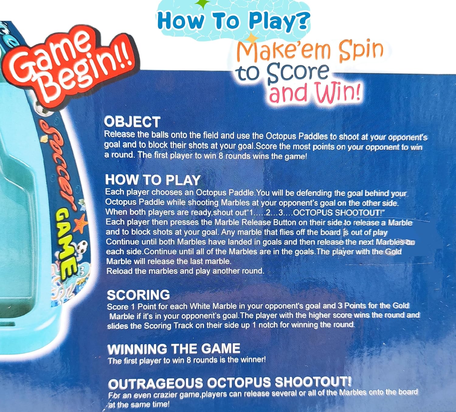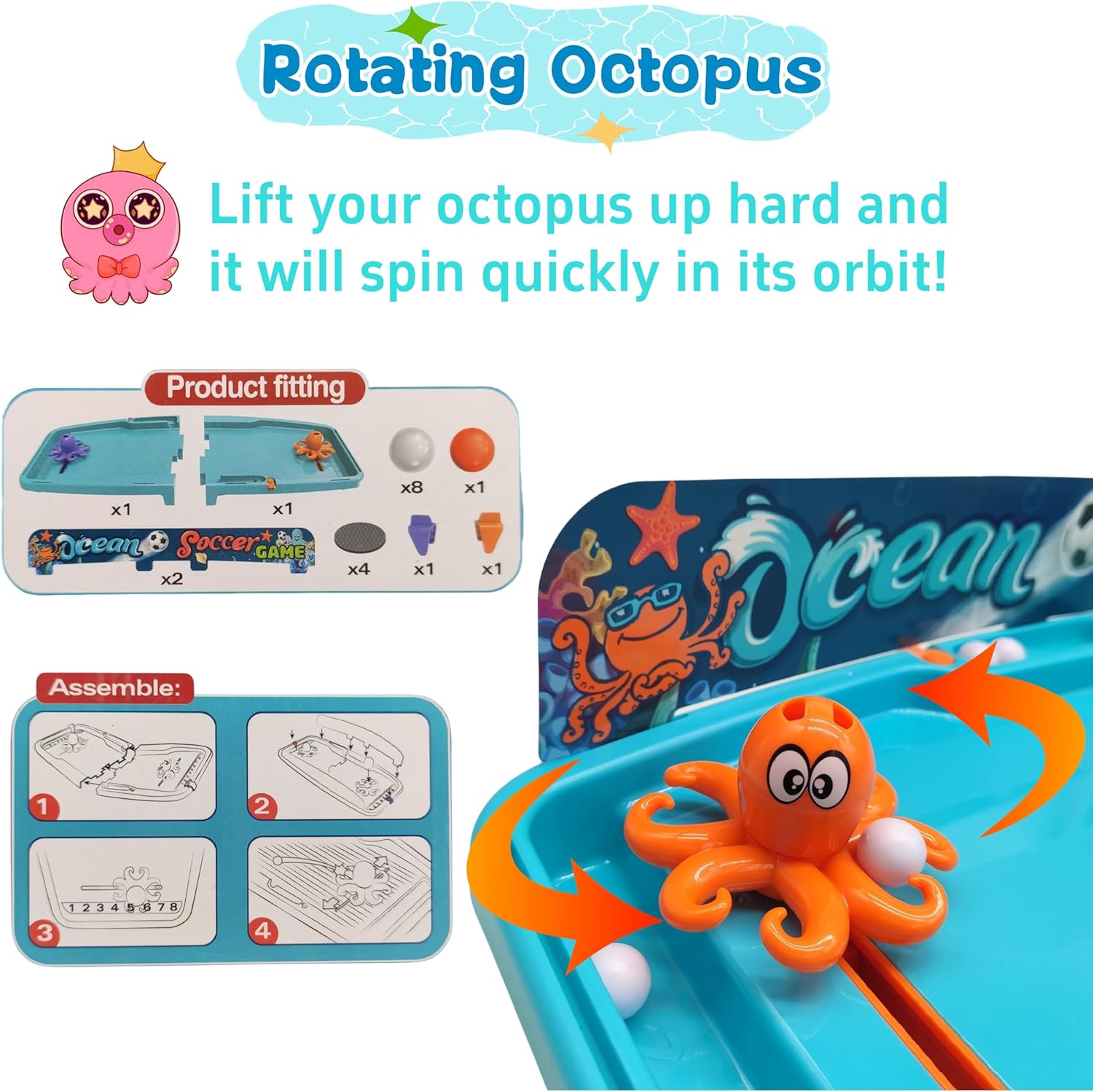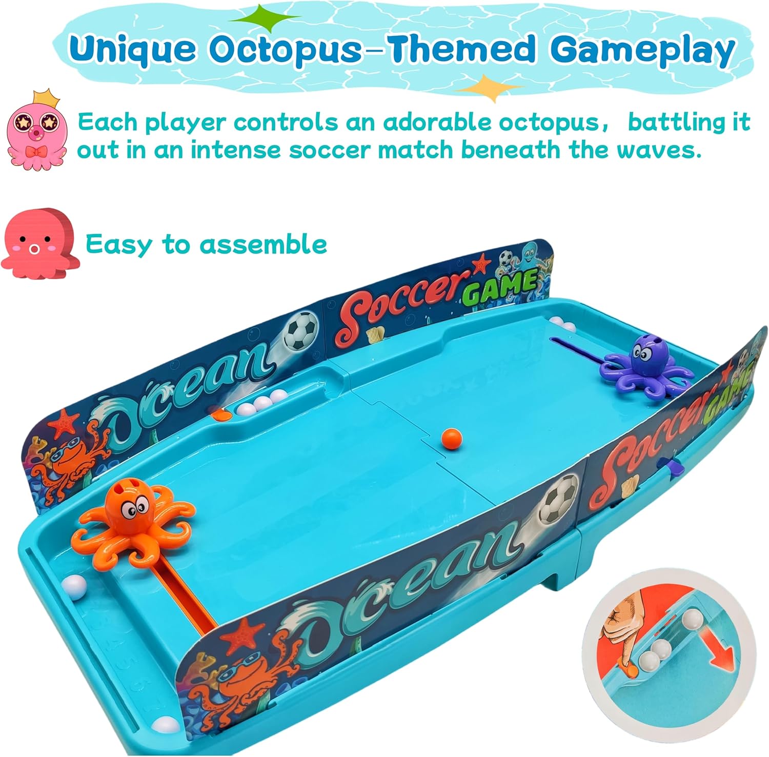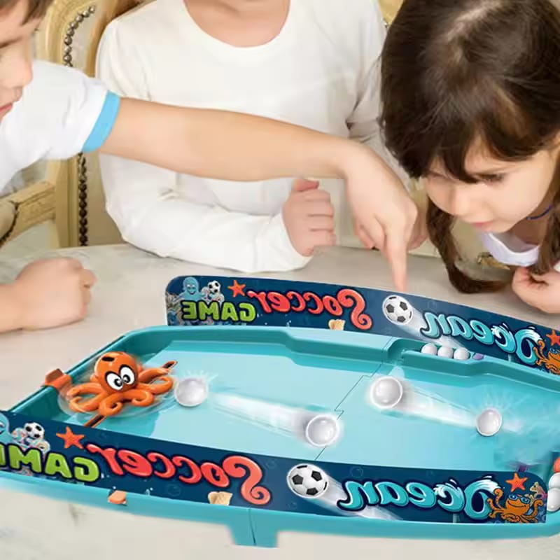 تتميز اللعبة بتصميم ملعب فريد مع ميل طفيف لضمان سرعة حركة الكرة، مما يُعيد إحياء حماس ملعب كرة القدم الحقيقي في بيئة داخلية صغيرة. يتحكم اللاعبون بأخطبوط لطيف بزعانف لصد الكرة وركلها وتمريرها، مما يُعزز مهاراتهم التنموية الأساسية. إنها لعبة مثالية لتنمية المهارات الحركية، والوعي المكاني، والتنسيق بين اليد والعين من خلال لعب شيق واستراتيجي.