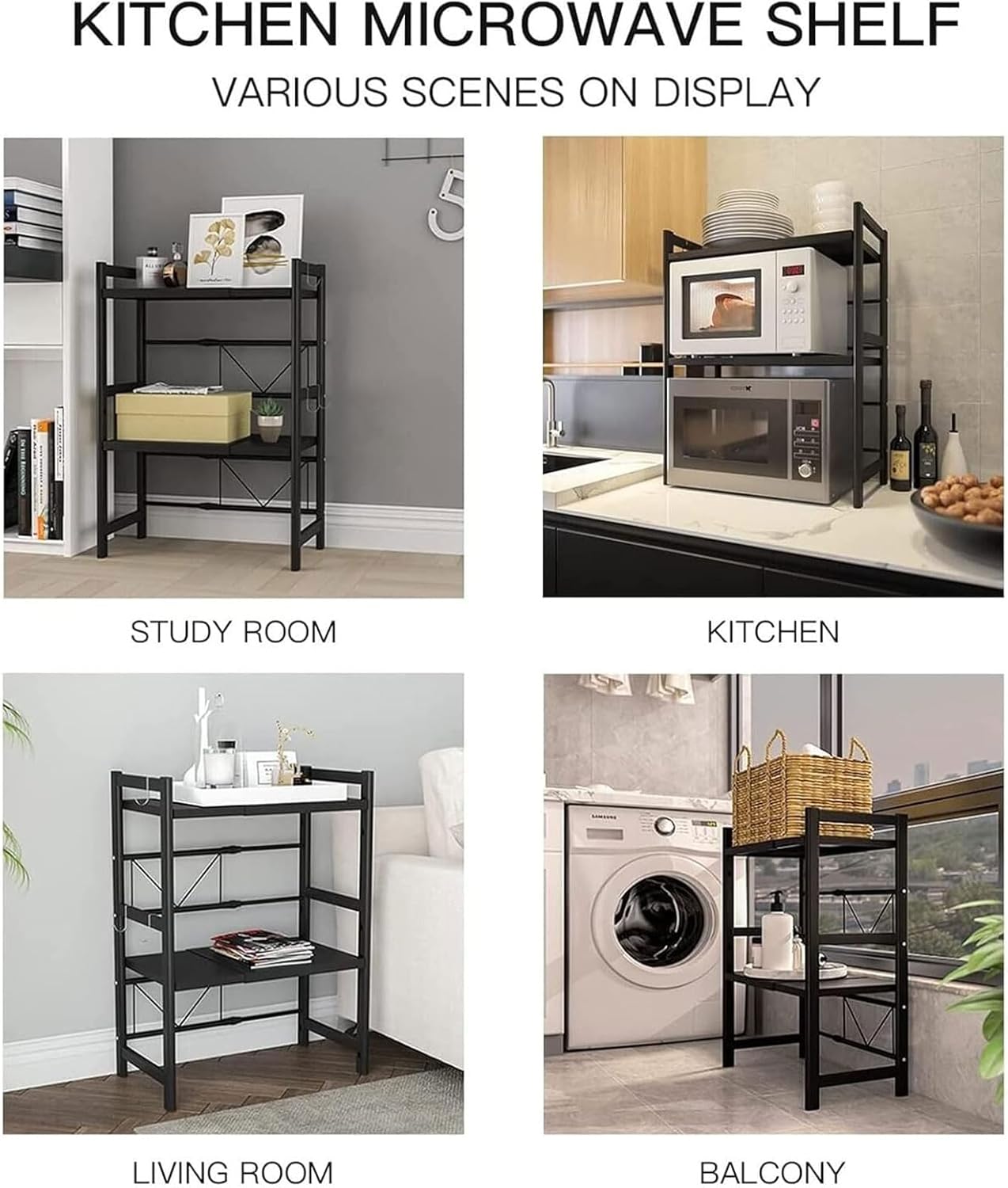 3-Tier Expandable Microwave Oven Rack - Adjustable Kitchen Countertop Organizer with Hooks & Cutting Board Holder