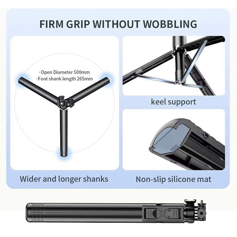 Stability is at the core of this design. The stabilized large tripod base features an innovative keel support system and wider shanks to ensure a firm grip without wobbling, even at full extension. Each leg is equipped with non-slip silicone mats to protect surfaces and maintain a steady shot. For ultimate convenience, the unit includes a detachable wireless Bluetooth remote for one-click shooting from a distance. With its extensive expansion ports, this "omnipotent rod" can support multiple devices, including secondary phones, cameras, and fill lights, making it the ideal all-in-one companion for vlogging, live streaming, and travel photography.