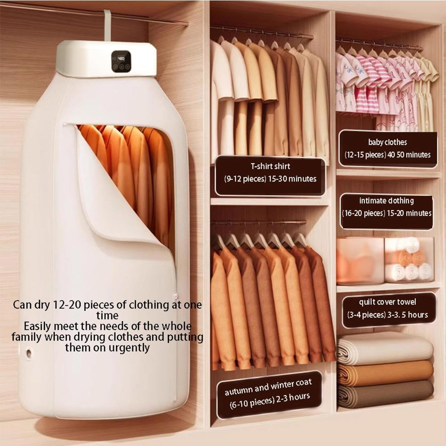 - Quick Drying: The dryer efficiently dries 9 to 12 pieces of clothes in just 15 to 30 minutes using powerful heat and strong airflow for fast drying when time is limited.